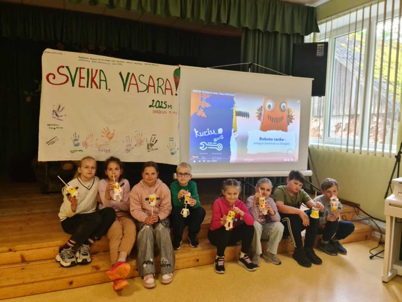 Pirmoji stovyklos diena prasidėjo šiltu susitikimu – vaikai rinkosi į bendrą ratą, kuriame kiekvienas turėjo progą prisistatyti, susipažinti su bendraamžiais ir vadovais. Buvo daug juoko, šypsenų ir lengvo jaudulio – juk laukė kupinas nuotykių pusdienis! Po susipažinimo sekė kūrybinės veiklos – visi kartu kūrėme stovyklos vėliavą, kuri taps mūsų simboliu visos stovyklos metu.  Pirmoji veikla buvo itin įdomi – Roboto ranka. Ją organizavo Lietuvos nacionalinės Martyno Mažvydo bibliotekos dirbtuvių „Pats sau“ komanda. Sukūrėme roboto ranką iš popierinių puodelių ir šiaudelio. Padarėme darbelį ir sukūrėme linksmą žaidimą.  Po trumpos pertraukos laukė dar viena smagi užduotis – 3D žirafos piešimas ir puošimas. Kiekvienas vaikas kūrė savitą žirafos versiją: vieni ją dekoravo spalvingais raštais, kiti klijavo įvairias medžiagas. Galiausiai visa stovyklos erdvė pasipuošė originaliomis, ryškiomis ir linksmai atrodančiomis žirafomis, bei vienu išskirtiniu gyvūnu – dinozauru.