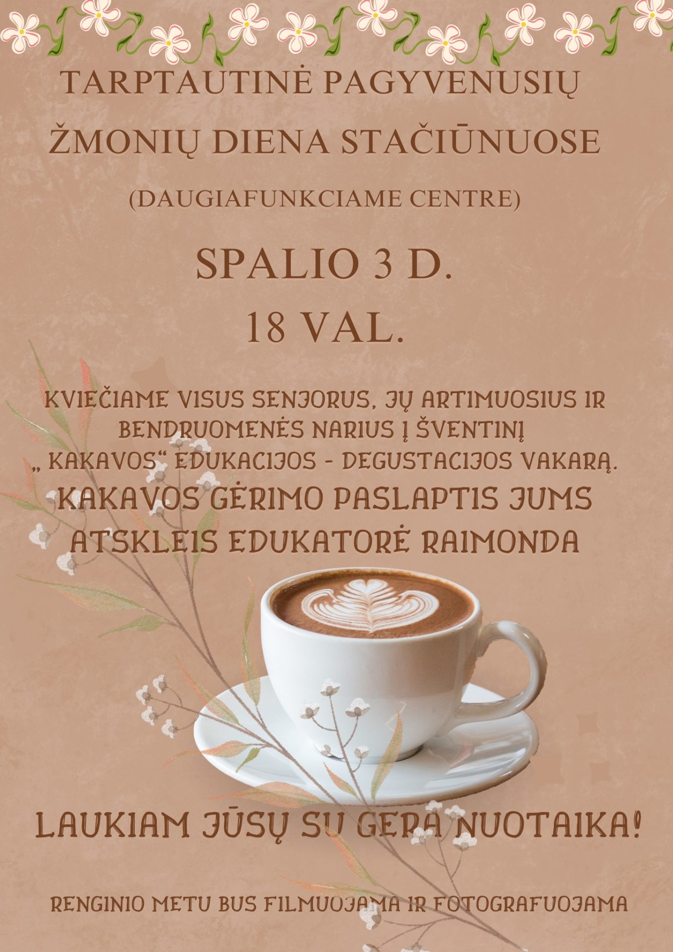 Kviečiame visus senjorus, jų artimuosius ir bendruomenės narius į šventinį „Kakavos edukacijos – degustacijos vakarą“.  Maloniai praleisime laiką kartu, mėgaudamiesi saldžiu kakavos gėrimu su pyragėliu ir šiltu bendravimu.